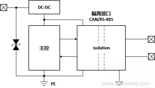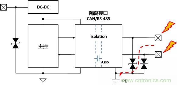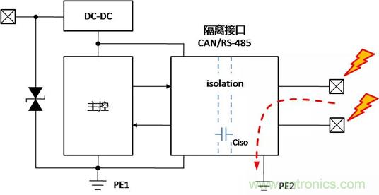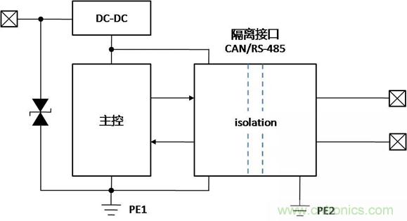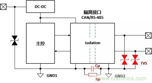 帶隔離通信接口的設備,在不同的使用、安裝狀態下,接口會表現出完全不同的ESD特性,了解設備在不同的使用狀態下,ESD對接口的影響的機理,才能有針對性地增加保護器件,提升隔離接口的ESD能力。下面以帶有隔離CAN或RS-485通信接口為例,對常見的設備狀態下,ESD的作用機理進行分析,并提出相應的改善措施。