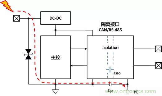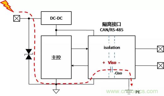 當總線側接口受到靜電放電時,靜電能量通過隔離接口模塊內部總線側器件泄放至PE,如圖 7。若ESD能量超出了接口模塊內部總線側器件的ESD抗擾能力,總線接口則可能損壞。