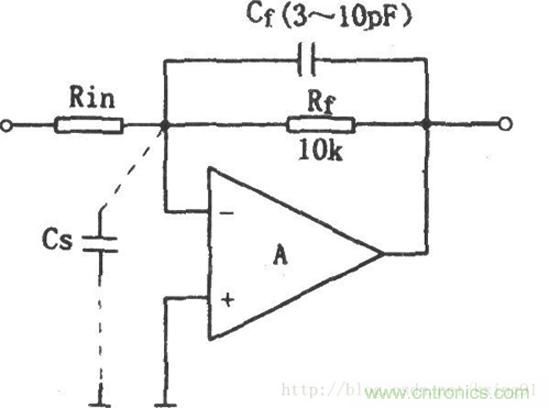 一般線性工作的放大器(即引入負反饋的放大電路)的輸入寄生電容Cs會影響電路的穩(wěn)定性,其補償措施見圖。放大器的輸入端一般存在約幾皮法的寄生電容Cs,這個電容包括運放的輸入電容和布線分布電容,它與反饋電阻Rf組成一個滯后網(wǎng)絡(luò),引起輸出電壓相位滯后,當輸入信號的頻率很高時,Cs的旁路作用使放大器的高頻響應(yīng)變差,其頻帶的上限頻率約為: