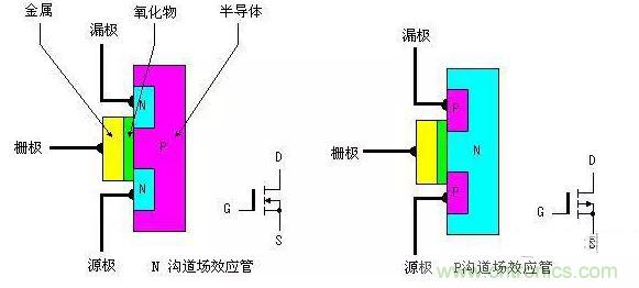 功率MOSFET的內(nèi)部結(jié)構(gòu)和電氣符號如圖所示,它可分為 NPN型和PNP型。NPN型通常稱為N溝道型,PNP型通常稱P溝道型。由圖1可看出,對于N溝道型的場效應(yīng)管其源極和漏極接在N型半導(dǎo)體上,同樣對于P 溝道的場效應(yīng)管其源極和漏極則接在P型半導(dǎo)體上。我們知道一般三極管是由輸入的電流控制輸出的電流。但對于場效應(yīng)管,其輸出電流是由輸入的電壓(或稱場電壓)控制,可以認(rèn)為輸入電流極小或沒有輸入電流,這使得該器件有很高的輸入阻抗,同時這也是我們稱之為場效應(yīng)管的原因。