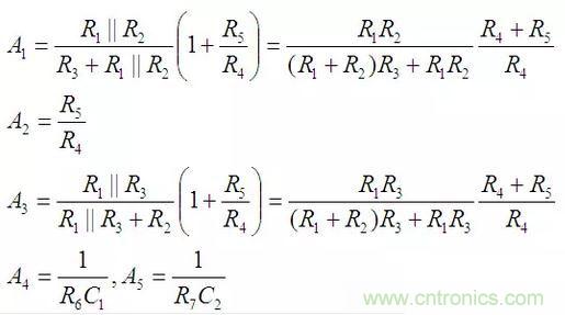 列寫系統(tǒng)各個(gè)通路的傳遞函數(shù)也與正向輸入型KHN濾波器完全相同,這里重復(fù)如下: