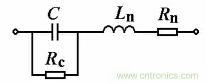 在交流下電容元件總有一定介質損耗,此外其引線也有一定電阻Rn和分布電感Ln,因此電容元件等效電路如圖 3所示。圖中C是元件的固有電容,Rc是介質損耗的等效電阻。等效阻抗為