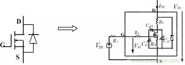 實際的功率MOSFET 可用三個結電容,三個溝道電阻,和一個內部二極管及一個理想MOSFET 來等效。三個結電容均與結電壓的大小有關,而門極的溝道電阻一般很小,漏極和源極的兩個溝道電阻之和即為MOSFET 飽和時的通態電阻。