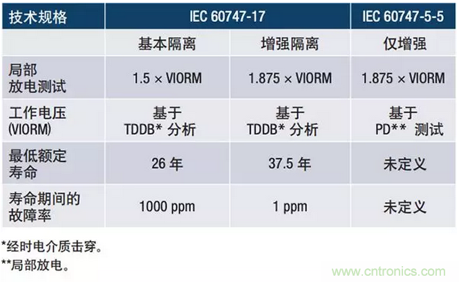 IEC 60747-17 (DIN V VDE V 0884-11)明確定義了采用感性和容性技術的絕緣,而公認的IEC 60747-5-5標準則被用來定義采用光耦合器技術的絕緣。然而,IEC 60747-5-5沒有規定通過TDDB分析來確定連續工作電壓和使用壽命。它依賴局部放電電壓測試來確定工作電壓,但并未定義器件的工作壽命。因此,感性和容性技術的最低額定壽命為37.5年,而對光耦合器隔離器則未作規定。