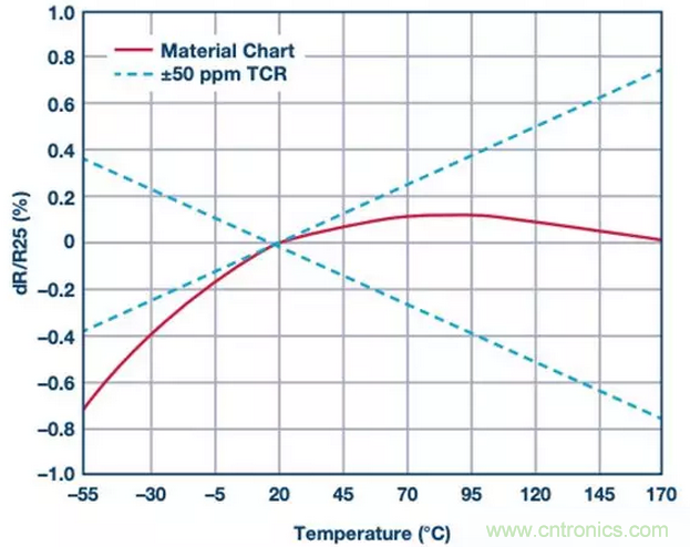 由鎳、銅、錳特殊合金制成的阻性元件的電阻溫漂曲線呈拋物線形狀,如圖2所示。對于電流檢測應用,這些合金是精度最高的材料。圖2還顯示了Bourns CSS4J-4026R型電阻溫漂的上限和下限,對應于50 ppm/°C的溫度系數。此差距是由電阻的銅引腳引起的,銅具有很高的TCR (4000 ppm/°C),導致溫漂增加。
