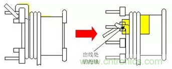 ④變壓器中有加鐵氟龍套且有折回線時,其出入線所加之鐵氟龍套管須與 骨架的凹槽口齊平(或至少達2/3高),并自骨架的凹槽出線以防止因套管過長造成拉力將線扯斷。但若為L形引腳水平方向纏線,則套管應與 骨架邊齊平(或至少2/3長),如圖7所示。