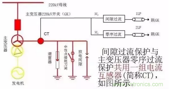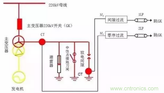 變壓器中性點間隙保護原理如下圖所示。