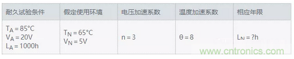 在此,我們一起來比較一下陶瓷電容器的加速試驗與實際產品使用的假定環境。我們將電容器的加速試驗中將耐久試驗時間視為LA,將實際使用環境下的相當年數視為LN,用于上述公式。