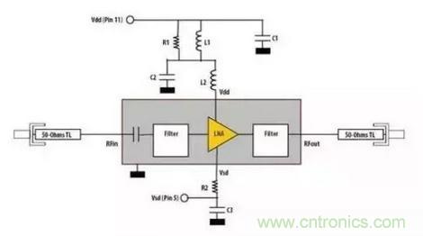 許多集成了線性線路的RF芯片對電源的噪音非常敏感,通常每個芯片都需要采用高達四個電容和一個隔離電感來確保濾除所有的電源噪音。一塊集成電路或放大器常常帶有一個開漏極輸出,因此需要一個上拉電感來提供一個高阻抗RF負載和一個低阻抗直流電源,同樣的原則也適用于對這一電感端的電源進行去耦。