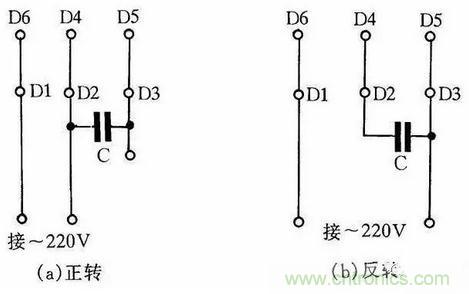 圖247為IDD5032型單相電容運轉(zhuǎn)電動機接線方法。其功率為60W,電容選用耐壓500V、容量為4μF的產(chǎn)品。圖3(a)為正轉(zhuǎn)接線,圖3(b)為反轉(zhuǎn)接線。