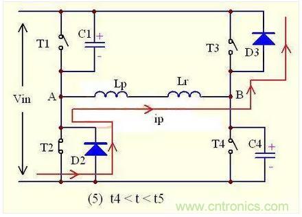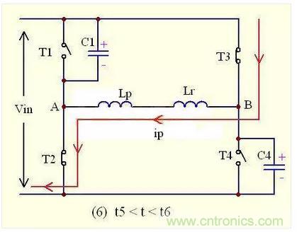 在t5-t6的時間內,副邊的二極管D1,D2還是同時導通流過電流,將副邊繞組短路,阻斷輸出電感反射到初級的途徑,此時的負載電流還是由次級電感與輸出電容提供;同時,由于原邊的T2,T3已經導通,原邊電流ip流過T3--Lr--T2,又因為Lr很小,所以原邊電流ip就會反向急劇增大。