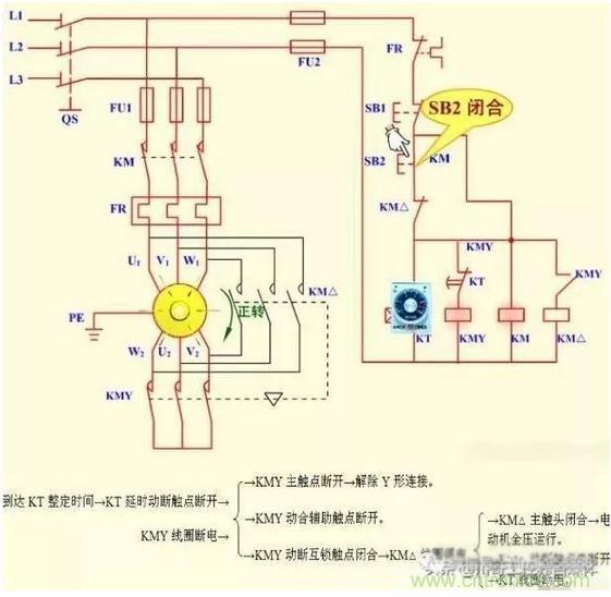 由電源隔離開關QST熔斷器FU1、FU2;交流接觸器KM、KMY、KMs;熱繼電器FR;時間繼電器KT;啟動按鈕SB2;停機按鈕SB1及電動機M組成。