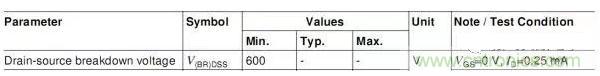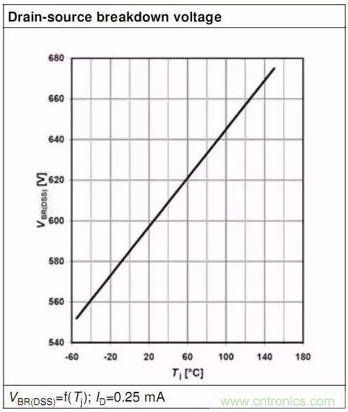 這個(gè)參數(shù)是有條件的,這個(gè)最小值600V是在Tj=25℃的值,也就是只有在Tj=25℃時(shí),MOSFET上電壓不超過(guò)600V才算是工作在安全狀態(tài)。