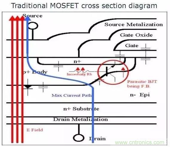 在MOSFET的結(jié)構(gòu)中,實(shí)際上是存在一個(gè)寄生三極管的,如上圖。在MOSFET的設(shè)計(jì)中也會(huì)采取各種措施去讓寄生三極管不起作用,如減小P+Body中的橫向電阻RB。正常情況下,流過(guò)RB的電流很小,寄生三極管的VBE約等于0,三極管是處在關(guān)閉狀態(tài)。雪崩發(fā)生時(shí),如果流過(guò)RB的雪崩電流達(dá)到一定的大小,VBE大于三極管VBE的開啟電壓,寄生三極管開通,這樣將會(huì)引起MOSFET無(wú)法正常關(guān)斷,從而損壞MOSFET。