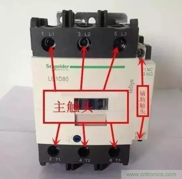 380伏交流接觸器有三個主觸頭,也就是電源進線和負載端出線,進線分別是三相火線L1、L2、L3,負載端出線分別是T1、T2、T3,接觸器主觸頭進線和出線上下一一對應,分別是L1對應T1,L2對應T2,L3對應T3,主觸頭在接觸器不吸合的狀態下是常開狀態。