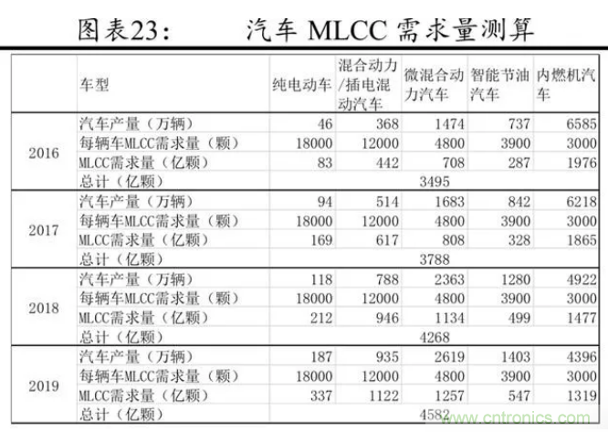 電動汽車對 MLCC 元件的需求量巨大,其中動力系統帶來的MLCC增量較為顯著。據前瞻研究院的數據,每輛汽車使用的電子元件,中端車平均為 6300 個,高端車為 8200 個,純電動汽車增加到14000個,其中有一半是 MLCC,這意味著隨著新能源汽車的不斷普及,MLCC 需求量會不斷增長。