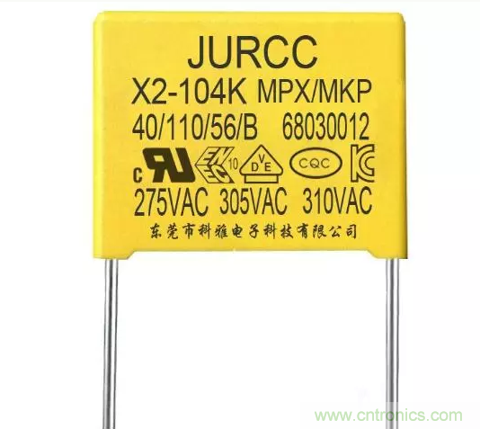 X電容是跨接在電力線兩線之間,即“L-N”之間,X電容器能夠抑制差模干擾,通常采取金屬化薄膜電容器,電容容量是uF級。X電容多數是方型,也就是類似于盒子的形狀,在它的表面一般都標有安全認證標志、耐壓字樣(一般有AC300V或AC275V)、依靠標準等信息。X電容雖然是CBB電容的一種,但是并不是每一種CBB電容就能做X電容必須要達到安規標準。