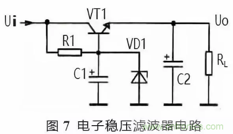 圖 6 所示是電子濾波器。電路中的 VT1 是三極管,起到濾波管作用,C1 是 VT1 的基極濾波電容,R1 是 VT1 的基極偏置電阻,RL 是這一濾波電路的負載,C2 是輸出電壓的濾波電容。