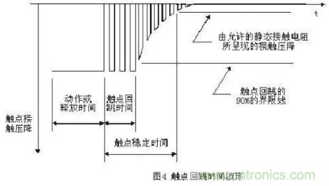 回跳時(shí)間包括吸合回跳時(shí)間和釋放回跳時(shí)間。由于繼電器是采用有彈性的機(jī)械觸點(diǎn)完成線路的接通和斷開,因此不同于由半導(dǎo)體器件組成的無觸點(diǎn)電子開關(guān),當(dāng)繼電器的觸點(diǎn)接通或斷開的瞬間會(huì)有一段不穩(wěn)定的接觸期,典型的觸點(diǎn)波形見圖4。