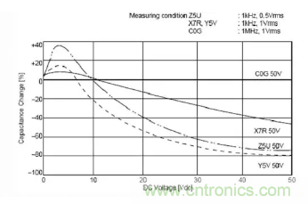 下面我們看一下C0G、X5R、Y5V三種材質(zhì)電容受環(huán)境溫度和直流工作電壓的影響。