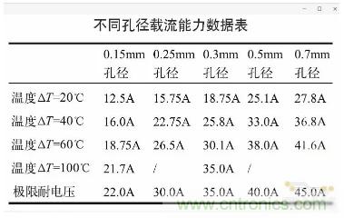 表2 17.5μm外層/35μm內層銅箔的PCB上不同孔徑載流能力數據表