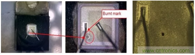 例2:日光燈電子鎮流器的PFC電路,系統在動態老化測試過程中,MOSFET產生損壞失效,測試實際的電路,在起動過程中,MOSFET實際驅動電壓只有5V左右,MOSFET相當于有很長的一段時間工作在線性區,器件形成局部熱點,而且離G極比較近,因此,器件是在開通過程中,由于較長時間工作線性區產生的失效,工作波形和失效形態如圖2、圖3所示。