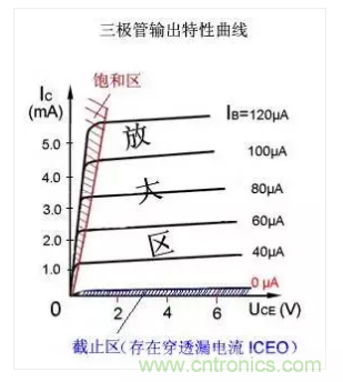 當(dāng)IB很大時(shí),IC變得很大,不能繼續(xù)隨IB的增大而增大,三極管失去放大功能,表現(xiàn)為開關(guān)導(dǎo)通。