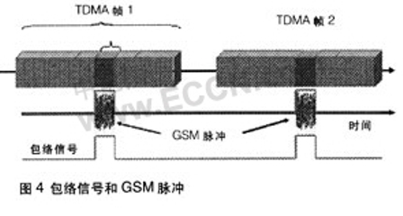 特定的手機只在屬于它的時間空當發射。包絡信號的基本頻率是1/4.615 ms=217Hz。諧波頻率為434Hz、651Hz等。如此頻率是聽得到的。如圖4所示,為手機的包絡信號。