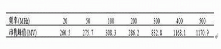 干擾源信號頻率越高,被干擾對象上的串擾幅值越大,我們對圖1中干擾源網絡AB上的信號頻率f1分別取不同頻率值時,對被干擾對象上的串擾進行了仿真,仿真結果見表2,信號頻率不同時的串擾波形見圖5,標記為“1”、“2”箭頭所指的波形頻率分別為“500MHz”、“100MHz”。