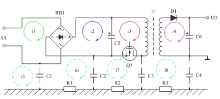 i4與變壓器初級的3個回路電流沒有直接關系,它是通過磁感應產生的,因此它不會產生差模信號干擾,但它會產生共模信號干擾,i4產生共模信號干擾的主要回路一個是通過對地電容C4,另一個是變壓器T1初、次級之間的電容(圖中沒有畫出)。