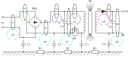 圖8是磁感應產生傳導干擾的原理圖,圖8表示開關電源變壓器產生的漏磁通穿過其它電路時,在其它電路中也產生感應電動勢,其中漏磁通M1、M2、M3產生的感應電動勢e1、e2、e3屬于是差模干擾信號;M5、M6、M7、M8產生的感應電動勢e5、e6、e7、e8屬于是共模干擾信號。