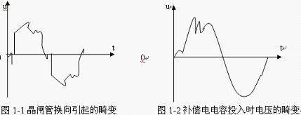 1)晶體管換流設備對變頻器的干擾:當供電網絡內有容量較大的晶閘管換流設備時,由于晶閘管總是在每相半周期內的部分時間導通,容易使網絡電壓出現凹凸(如圖1-1所示)。它使變頻器輸入側的整流電路有可能因此出現較大的反向回復電壓而受到損害。