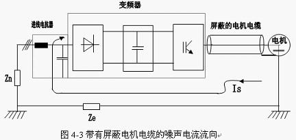 使用屏蔽電機電纜:對于高頻干擾,如果高次諧波干擾電流Is有一條合理的通道,則高頻干擾是可以得到抑制的。如果使用非屏蔽電纜,則高次干擾諧波電流Is以一個不確定的路線流回變頻器,并在此回路中產生高頻分量壓降,影響干擾其它設備。為使高次諧波干擾電流Is能沿確定路線流回變頻器,需要采用屏蔽電機電纜(如圖4-3所示)。電纜屏蔽層必須連接到變頻器外殼和電機外殼上,當高次諧波干擾電流Is必須回變頻器時,屏蔽層形成一條有效的通道。這樣,高次諧波干擾電流就不會在Ze上產生壓降,在Zn上的壓降可由進線電抗干擾濾波器來抑制(如圖4-2中的F12)。
