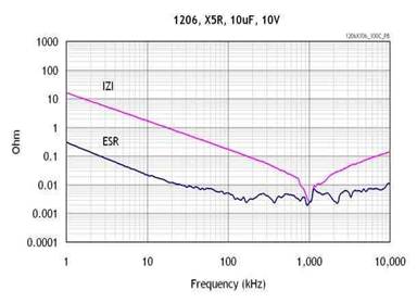 LDO需要增加外部輸入和輸出電容器。利用較低ESR的大電容器一般可以全面提高電源抑制比(PSRR)、噪聲以及瞬態性能。陶瓷電容器通常是首選,因為它們價格低而且故障模式是斷路,相比之下鉭電容器比較昂貴且其故障模式是短路。輸出電容器的等效串聯電阻(ESR)會影響其穩定性,陶瓷電容器具有較低的ESR,大概為10mΩ量級采用陶瓷電容時,建議使用X5R和X7R電介質材料,這是因為它們具有較好的溫度穩定性。圖為X5R的ESR和頻率曲線。