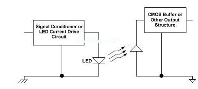 光耦合技術是在透明絕緣隔離層(例如:空氣間隙)上的光傳輸,以達到隔離目的。圖5顯示了一款數字隔離器的主要組件。該電流驅動器采用數字輸入,并將信號轉換為電流來驅動發光二極管(LED)。輸出緩沖器將光電探測器的電流輸出轉換為一個數字輸出。