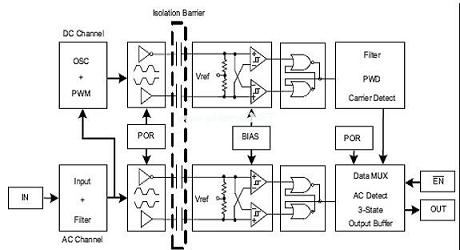 為了提供恒定信息的傳輸,ISO72x使用一個高信號速率和低信號速率通道來進行通信,如圖9所示。高信號速率通道未被編碼,并且其在一個單端到差分轉換之后的隔離層上傳輸數據。該低信號速率通道以一種脈寬調制格式對數據進行編碼,并在隔離層上差分傳輸數據,從而確保了恒定狀態的精確通信(1和0的長字符)。
