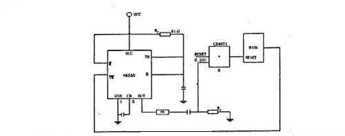采用單穩(wěn)態(tài)觸發(fā)器NE555作為微機(jī)看門(mén)狗電路;當(dāng)系統(tǒng)工作正常時(shí),看門(mén)狗電路不起作用,當(dāng)系統(tǒng)運(yùn)行不正常時(shí),80C51的P1.1引腳不能給定時(shí)器送去觸發(fā)脈沖,這時(shí)NE555中單穩(wěn)態(tài)觸發(fā)器就輸出脈寬大于4US負(fù)脈沖,經(jīng)F6反相后加至80C51的復(fù)位端,使系統(tǒng)可靠的復(fù)位,這樣可防止因外界干擾引起的程序跑飛,使微機(jī)程序正常運(yùn)行,見(jiàn)圖1。