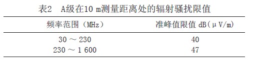 根據(jù)鐵路客運(yùn)專(zhuān)線標(biāo)準(zhǔn)規(guī)定,傳導(dǎo)騷擾限值和輻射騷擾限值如表1、2所示。