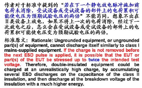 關(guān)于不接地設(shè)備的試驗(yàn)配置,新版標(biāo)準(zhǔn)與舊版標(biāo)準(zhǔn)的配置是相同的。關(guān)鍵是在單次放電時(shí)(無(wú)論是空氣的,還是接觸的),試品上的電荷應(yīng)當(dāng)在每次施加靜電放電脈沖之前先行釋放(釋放掉在需要施加靜電放電的金屬點(diǎn)或金屬部位上的電荷)。