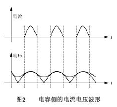 本電路中,交流輸入電壓Ui經功率二極管整流橋變為正弦脈動電壓,經電容C12平滑后變為直流,但電容電流的波形不是正弦波而是脈沖波。如圖2所示。