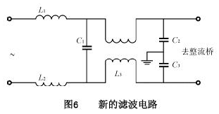 本電路主要的EMI問題是電源噪聲傳入電網,將原來的共模扼流圈L11與電容C11及C12組成的濾波電路變為如圖6所示電路。L1,L2,C1可除去差模干擾,L3,C2,C3可除去共模干擾。L1,L2為不易磁飽和的材料;C1可選陶瓷電容;L3為共模扼流圈;選定C=C2=C3及截止頻率fo,則可根據L3=1/〔(2πfo)2C〕計算L3;選定C1及截止頻率fo,可根據L1=L2=1/〔2(2πfo)2C1〕計算L1及L2。