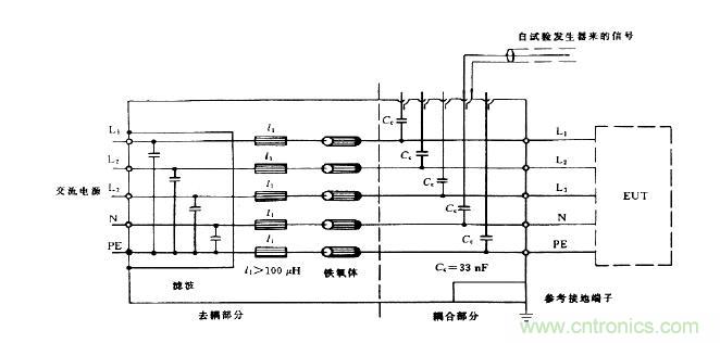 作為佐證,我們利用電源線耦合/去耦網(wǎng)絡(luò)來加以說明:在圖中可以看到從試驗(yàn)發(fā)生器來的信號電纜芯線通過可供選擇的耦合電容加到相應(yīng)的電源線(L1、L2、L3、N及PE)上,信號電纜的屏蔽層則和耦合/去耦網(wǎng)絡(luò)的機(jī)殼相連,機(jī)殼則接到參考接地端子上。這就表明脈沖群干擾實(shí)際上是加在電源線與參考地之間,因此加在電源線上的干擾是共模干擾。