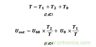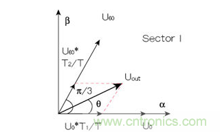 由8個基本電壓空間矢量可以合成任意定子電壓矢量。如圖4所示,以U0, U60扇區為例,若在一個PWM周期T內,同時輸出T1時間U0矢量和T2時間的U60矢量,則由矢量(T1/T)U0,(T2/T)U60可以合成給定的參考電壓矢量Uout。