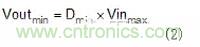 試圖在2MHz條件下工作時的第二個考慮因素是最小輸入電壓(VIN)和輸出電壓(VOUT)的轉(zhuǎn)換比。這與轉(zhuǎn)換器的最小接通時間有關(guān),因為該比率在轉(zhuǎn)換器需要操作時設(shè)定接通時間。例如,若轉(zhuǎn)換器具有100ns的最小導(dǎo)通時間且在2MHz條件下工作,則使用公式1,其可以支持的最小轉(zhuǎn)換比(Dmin)為20%。若給定的VIN至VOUT比所需的導(dǎo)通時間小于最小導(dǎo)通時間,則多數(shù)轉(zhuǎn)換器進入脈沖跨越模式以保持輸出電壓穩(wěn)定。當(dāng)脈沖跨越時,開關(guān)頻率發(fā)生變化且可能在需要限制噪聲的頻率中引起噪聲。