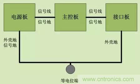 靜電要得到有效釋放,就要保證良好的接地。對于醫療電子,一般的醫療電子產品比如監護儀,機身后面都會有一個等電位接地端。在做ESD試驗的時候,這個接地 端也是要接大地的,這樣就有了一個靜電快速泄放的途徑。如圖5.1,假如主電路板分為三個模塊:電源板,主控板和接口板,接口板的接口外殼地要和信號地分 開,然后接口板的外殼地和等電位端用粗導線相連。系統的信號地可以從電源板的外殼地與信號地相連然后共用一根粗導線與等電位端相連。之所以沒有采用每塊板 都分別接到等電位端的星形接地方法,是因為星形接地會形成接地環路,從而增加射頻噪聲和容易受電磁干擾。
