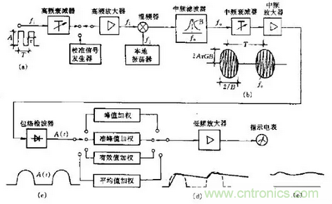 其電路結構類似于半導體收音機。測量時先將測量儀調諧,對準某個頻率fi。該頻率經高頻衰減器和高頻放大器后進人混頻器,與本地振蕩器的頻率fl混頻,產生很多混頻信號。經過中頻濾波器以后僅得到中頻f0=fl-fi。中頻信號經中頻衰減器、中頻放大器后,由包絡檢波器進行包絡檢波,濾去中頻得到其低頻包絡信號A(t)。A(t)再進一步進行加權檢波,加權可根據需要獲得A(t)的峰值(Peak)、有效值(rms)、平均值(Ave)或準峰值(QP),這些值經低頻放大后可推動電表指示。測量前如果用校準信號發生器的信號進行預先校準, 則可以直接讀數。騷擾信號的讀數等效于正弦信號的有效植。