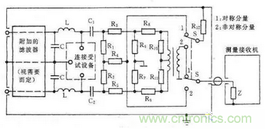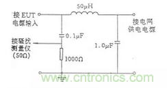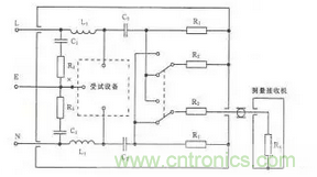 連續騷擾電壓測量主要測量EUT沿著電源線向電網發射的騷擾電壓,測量頻率為0.15~30MHz。測量一般在屏蔽室內進行。測量時需要在電網和EUT之間插入一個人工電源網絡(LISN或AMN),其原理如圖15所示。AMN的作用是隔離電網和EUT,使測到的騷擾電壓
