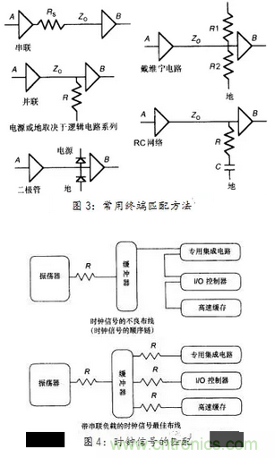 為了抑制出現(xiàn)在印制線終端的反射干擾,除了特殊需要之外,應(yīng)盡可能縮短印制線的長度和采用慢速電路。必要時可加終端匹配。終端匹配方法比較多,常見終端匹配方法見圖3所示。根據(jù)經(jīng)驗(yàn),對一般速度較快的TTL電路,其印制線條長于10cm以上時就應(yīng)采用終端匹配措施。匹配電阻的阻值應(yīng)根據(jù)集成電路的輸出驅(qū)動電流及吸收電流的最大值來決定。時鐘信號較多采用串聯(lián)匹配,見圖4所示。