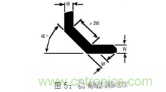與過孔相似,直角的轉(zhuǎn)彎路徑應(yīng)該被避免,因?yàn)樗趦?nèi)部的邊緣能產(chǎn)生集中的電場。該場能耦合較強(qiáng)噪聲到相鄰路徑,因此,當(dāng)轉(zhuǎn)動路徑時全部的直角路徑應(yīng)該采用45度。圖5是45度路徑的一般規(guī)則。