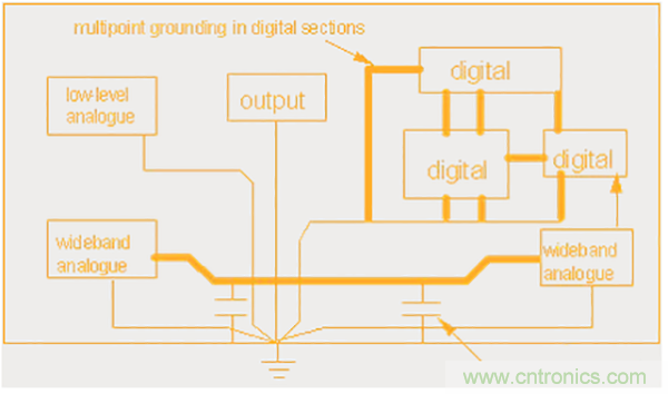 d、接地:同類電路單獨分布地,在單板上單點相連
